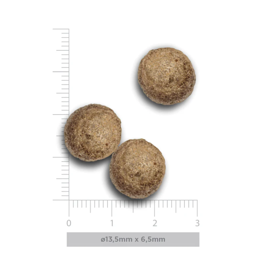 ◦ Ingredientes: Pollo deshidratado 12,4%, pavo deshuesado preparado en fresco 8,5%, arroz extrusionado, guisantes verdes enteros, pavo deshidratado 8,3%, avena integral 8,3%, arroz integral 8%, aceite de pollo (protegido con tocoferoles naturales) 6,9%, guisantes amarillos enteros, pollo deshuesado preparado en fresco 4,1%, cebada integral 4,1%, hígado de pollo preparado en fresco 3,3%, pato deshuesado preparado en fresco 2,6%, hígado de pollo hidrolizado 1,6%, pato deshidratado 1,5%, pulpa de remolacha, fibra de manzana, hígado de pavo hidrolizado 0,8%, minerales, semillas de lino (fuente natural de ácidos grasos ω3) 0,5%, aceite de pescado (protegido con tocoferoles naturales) 0,5%, levaduras (Saccharomyces cerevisiae), brócoli fresco 1000 mg/kg, calabaza fresca 1000 mg/kg, zanahorias frescas 1000 mg/kg, achicoria (fuente de FOS) 500 mg/kg, glucosamina 1000 mg/kg, condroitina 600 mg/kg, pared celular hidrolizada de levaduras (fuente de MOS) 500 mg/kg, extracto de mandarina 400 mg/kg, Yucca schidigera 200 mg/kg, alga kelp 30 mg/kg, arándanos rojos enteros 30 mg/kg, rosa canina (rica en vitamina C) 30 mg/kg, té verde 30 mg/kg, cúrcuma 30 mg/kg.