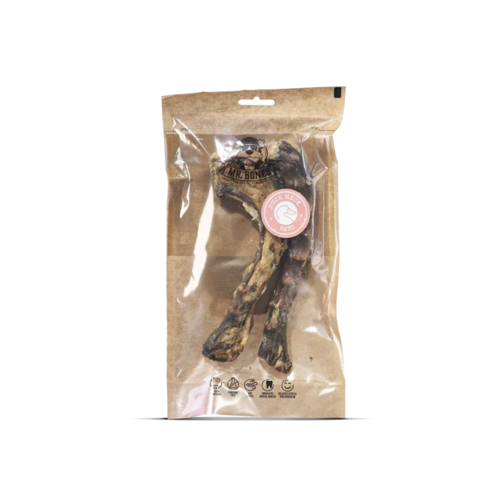 Snack natural ideal de aproximadamente 18 cm para perros que disfrutan de la masticación. Elaborado al 100 % con cuello de pato, sin cereales, sin aditivos y sin conservantes, se obtiene mediante un proceso de deshidratado lento que mantiene el sabor auténtico y los nutrientes de la carne.
