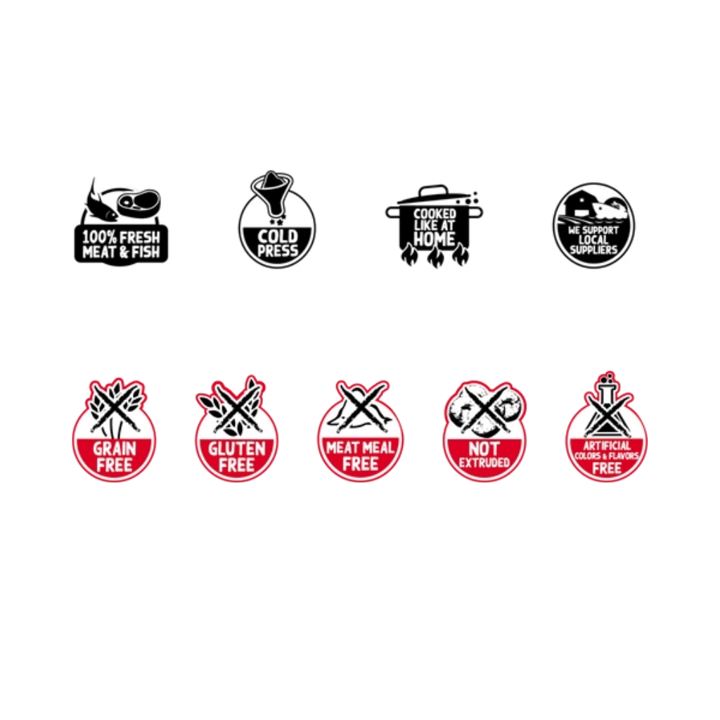 ◦ Ingredientes: 55% pollo fresco, 20% pescado entero fresco, 10% hígado de cerdo fresco, almidón hidrolizado, glicerina vegetal (USP).