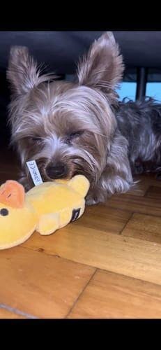 Este pollito es otro de los juguetes preferidos de nuestra Teckel. Tiene un bolsillito detrás donde poder guardar su snack preferido. A veces se lo escondemos y se divierte muchísimo buscándolo.